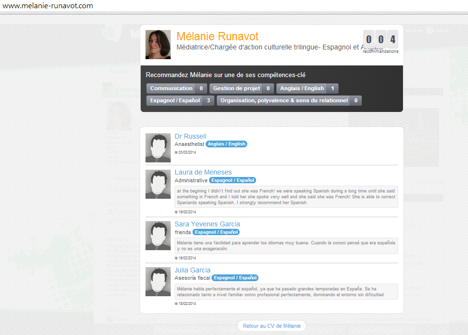 Trilingue Français-Espagnol-Anglais et diplômée d'un master de Médiation Culturelle axé vers l'international, je me suis spécialisée dans la conception et l'organisation de projets culturels. Passionnée par toutes les formes culturelles, polyvalente organisée, motivée et souriante, je suis disponible, dès aujourd'hui pour relever de nouveaux défis et intégrer une équipe dynamique !